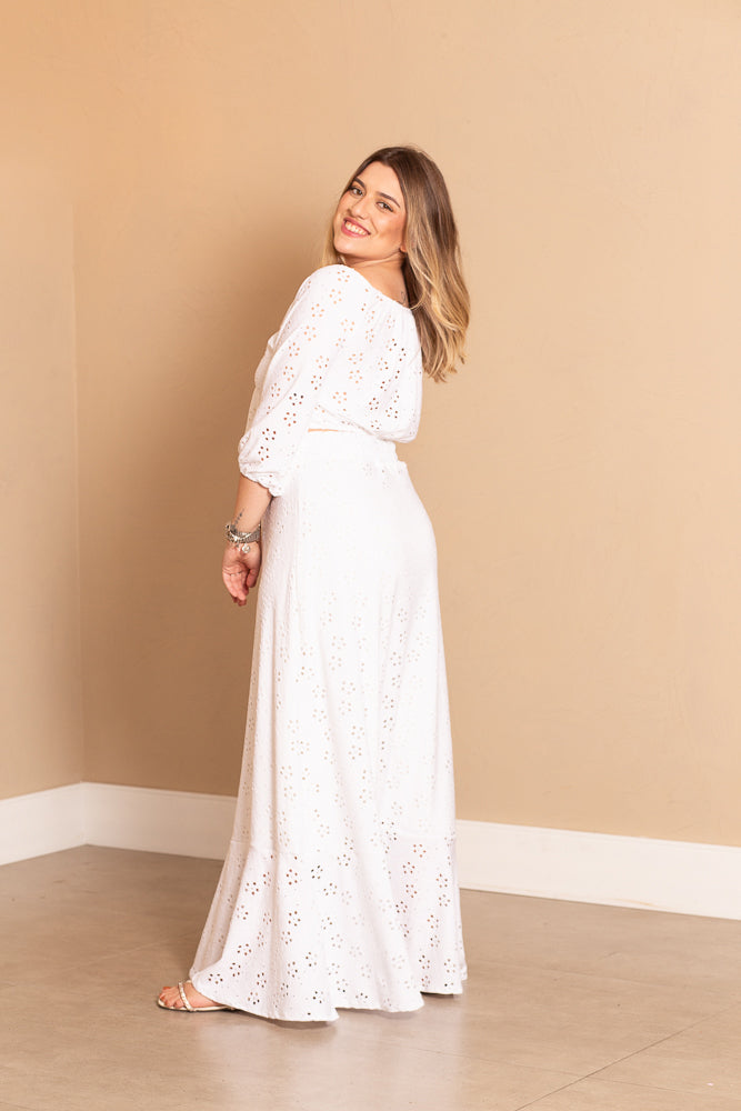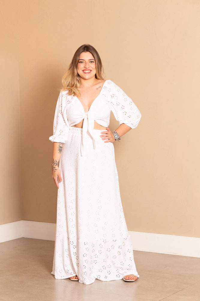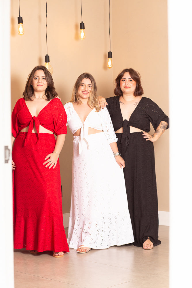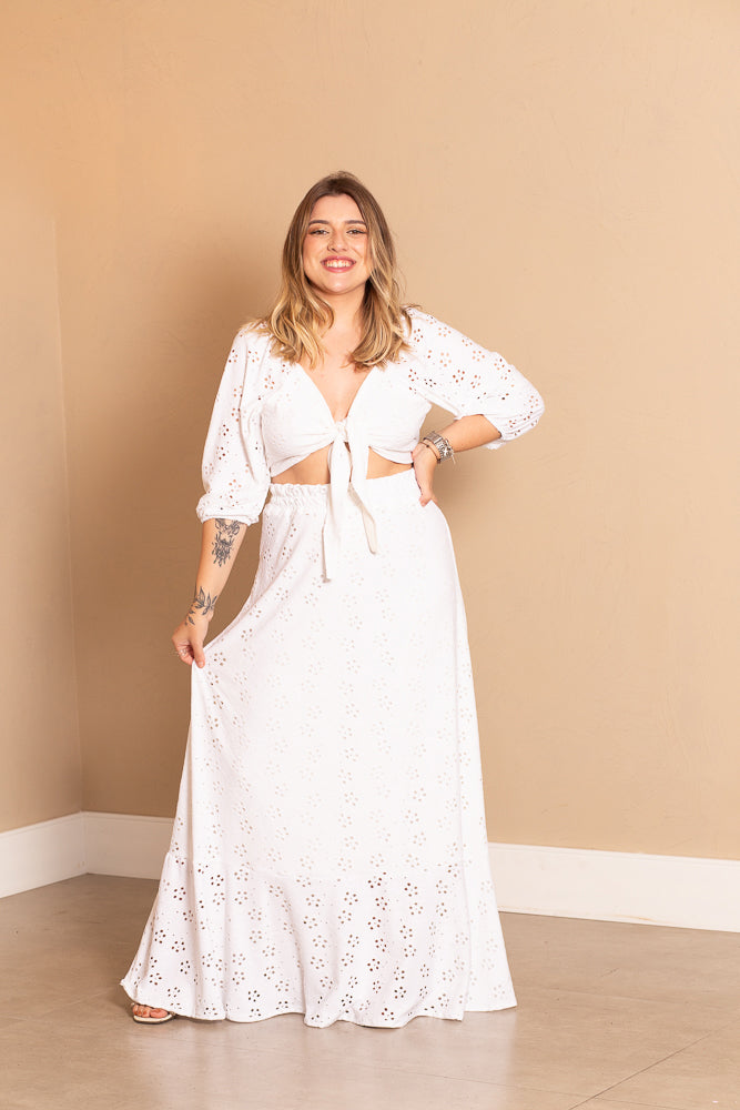 A saia valoriza o bumbum e não marca a barriga, podendo ser usado como conjunto com a blusa de amarrar em Laise.