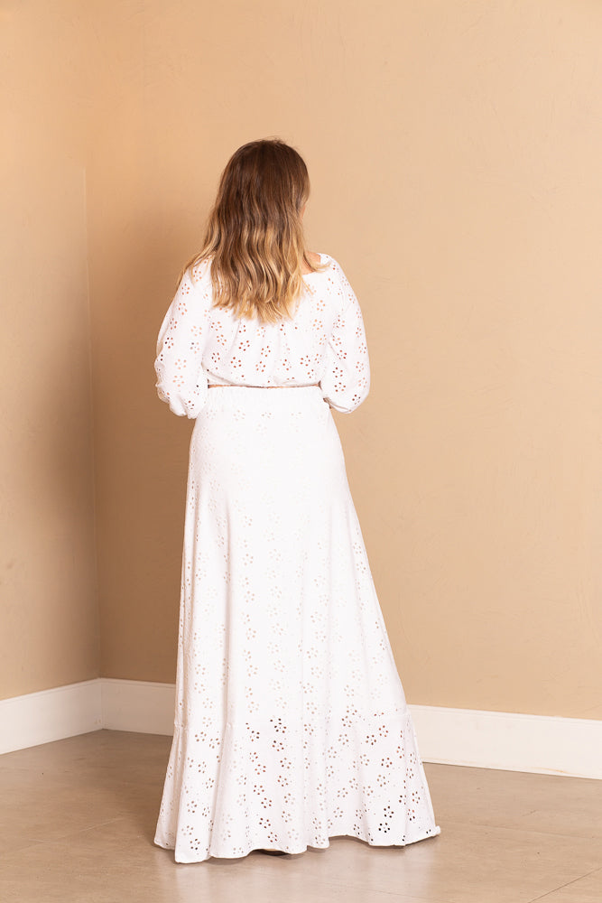 Saia em malha laise com roda ampla com babado na parte de baixo. Tem elástico na cintura super confortável que não machuca!