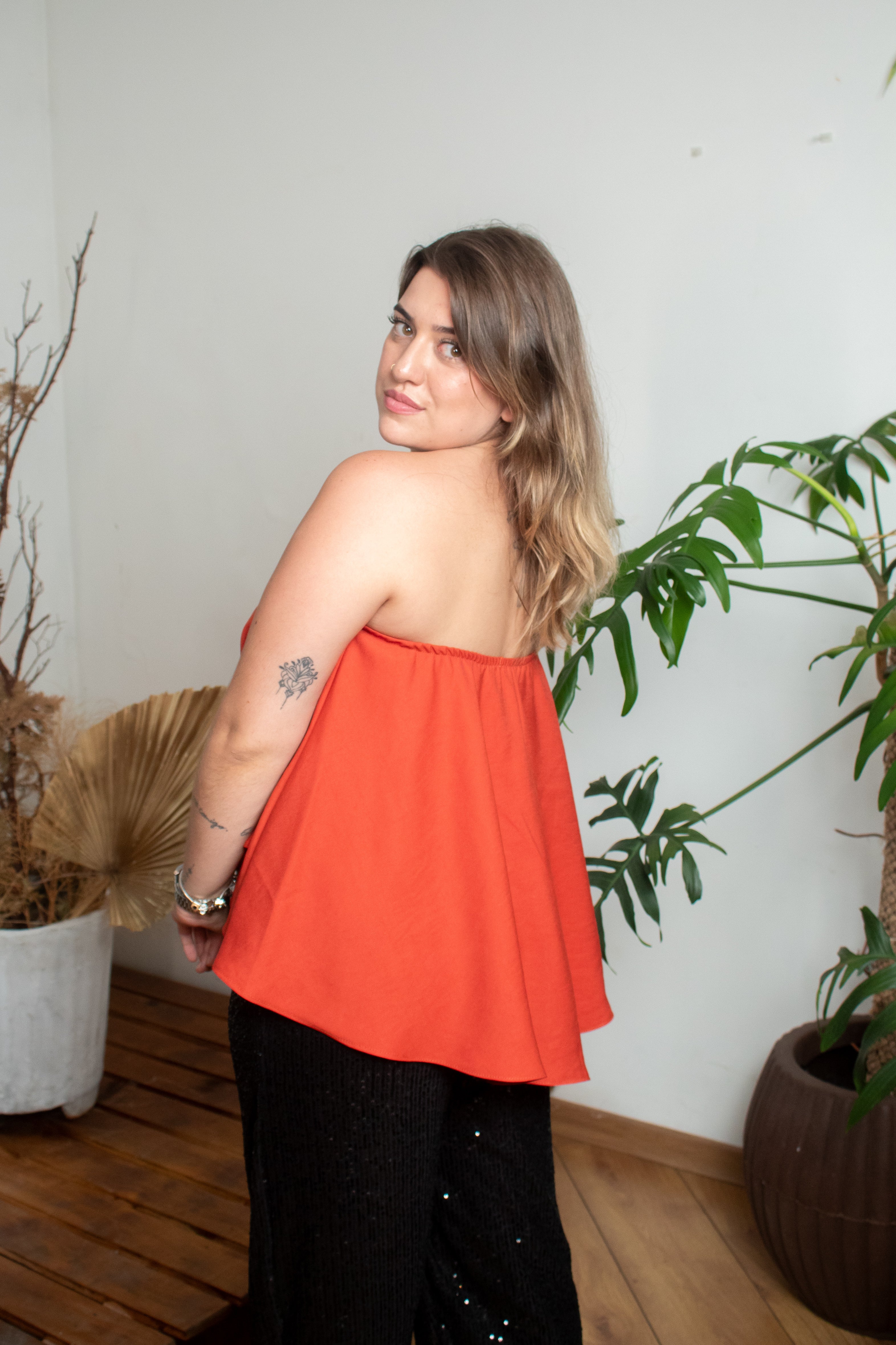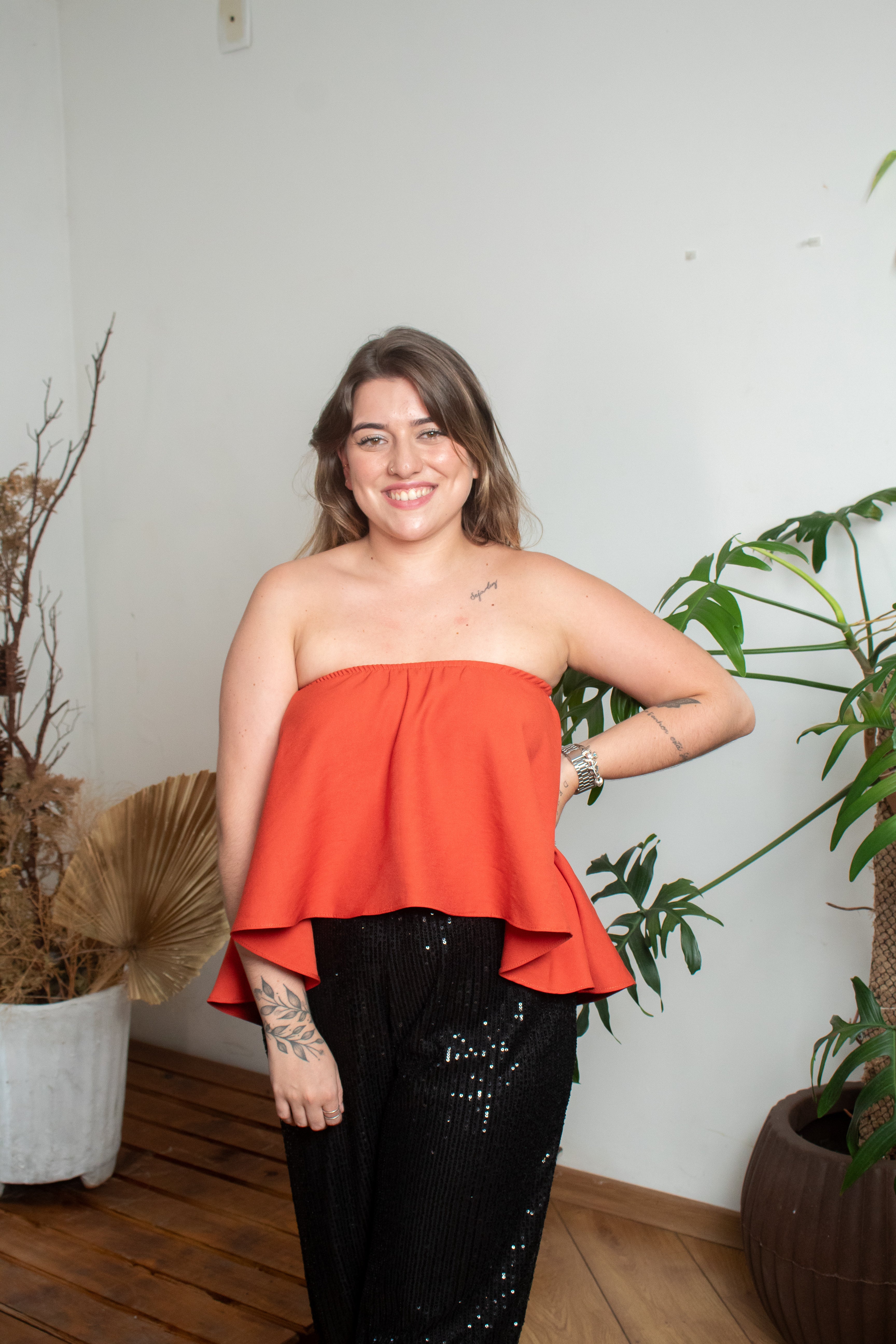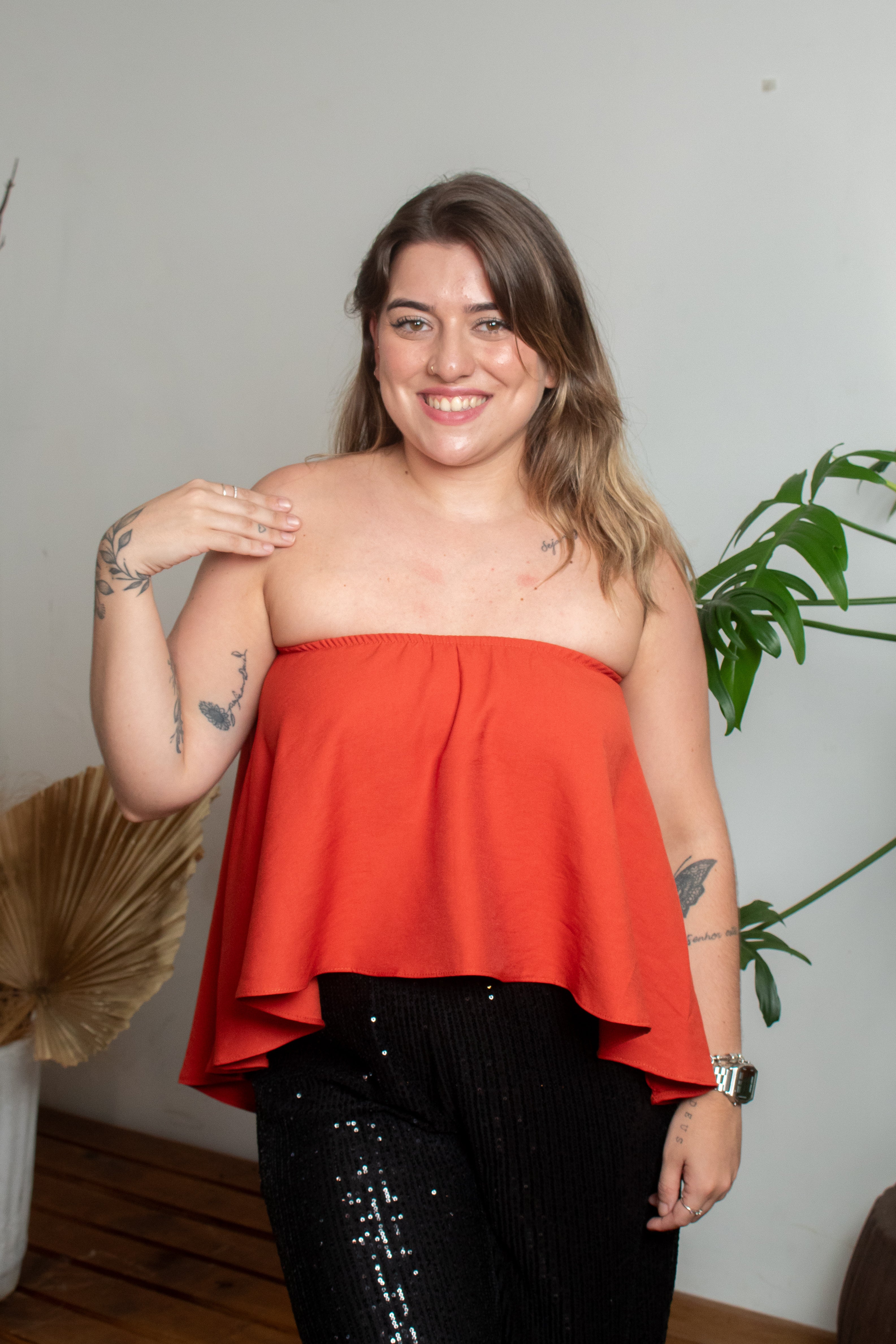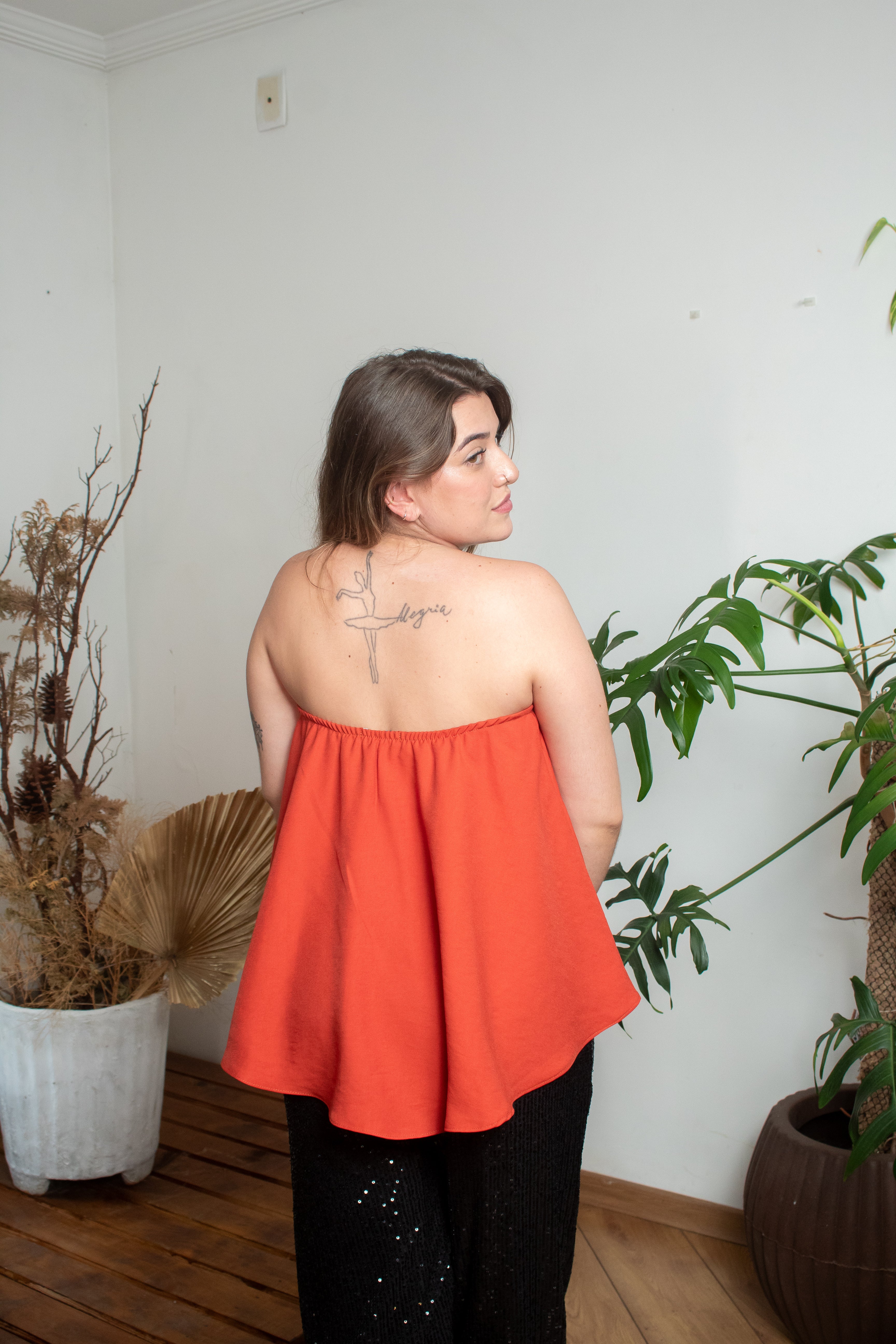 Blusa tomara que cai estilo bata curta na frene e comprida atrás