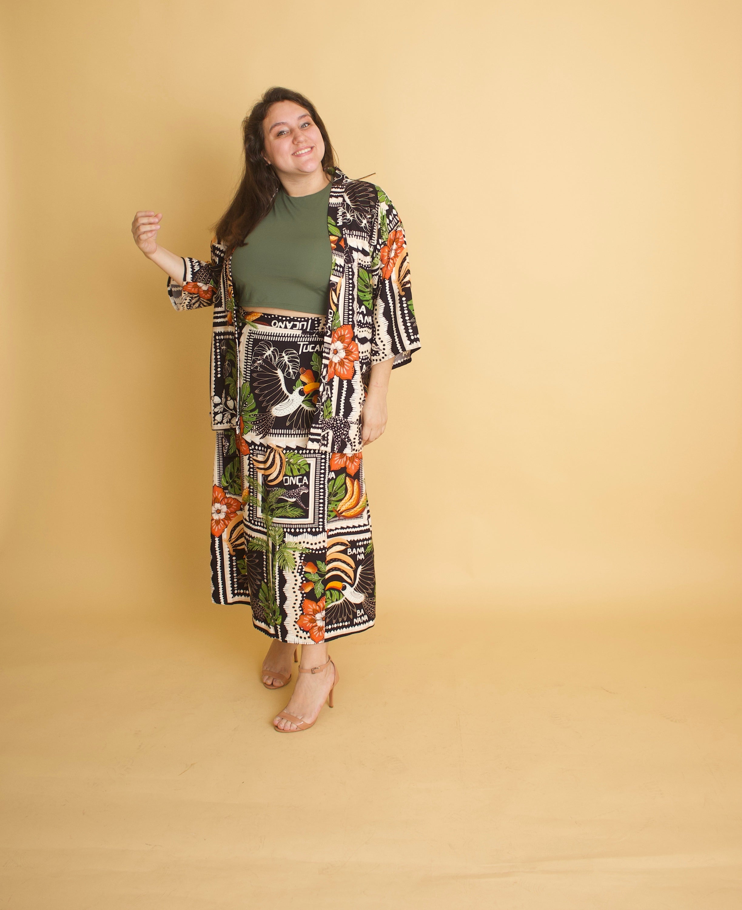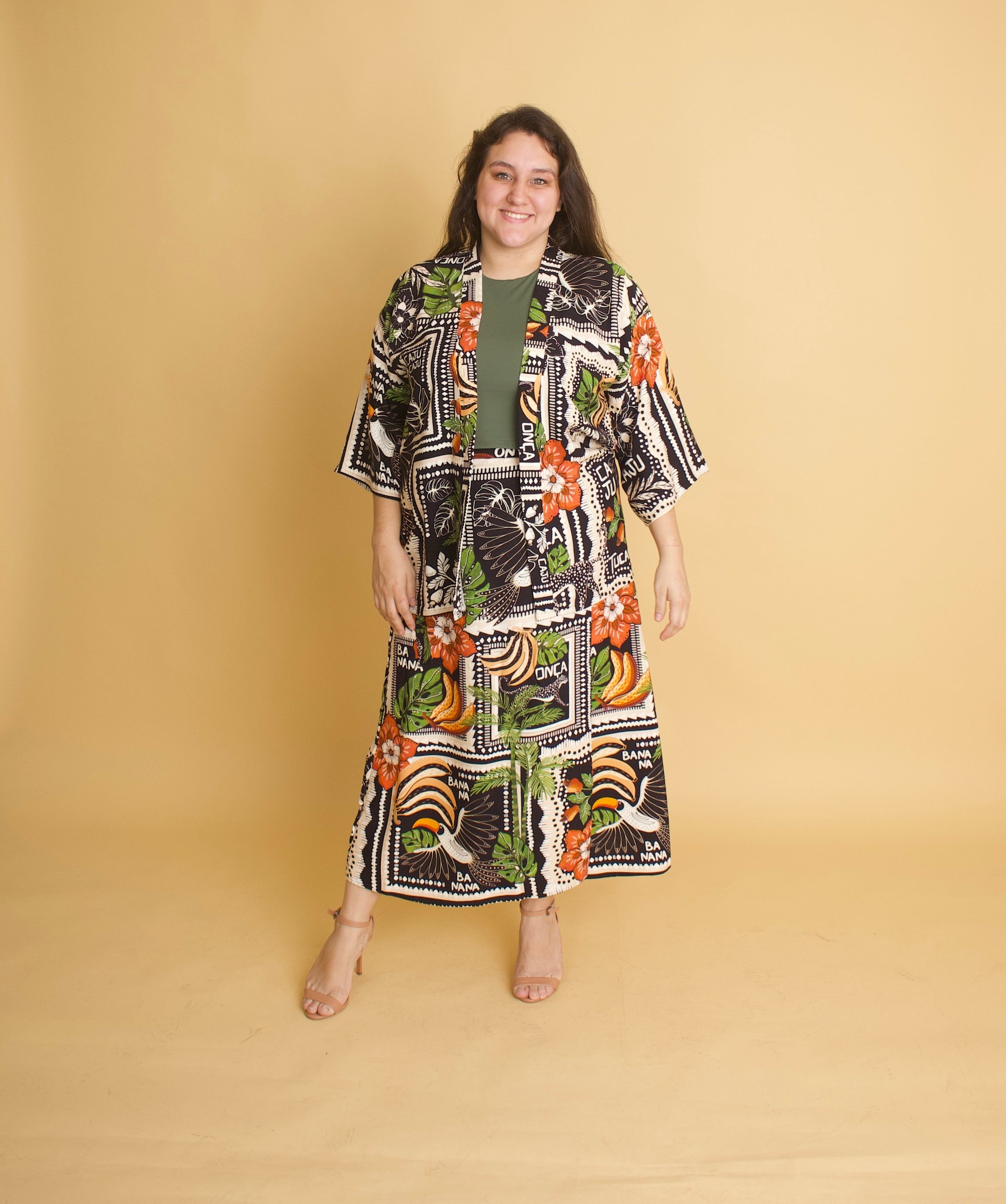 O nosso kimono foi desenvolvido pra você que quer deixar seu look mais despojado. Ele é um traje típico da cultura japonesa mas sofreu uma repaginação ganhando assim um novo visual. Com isso foi introduzido no mundo da moda, como um "casaco" feminino, só que mais leve.