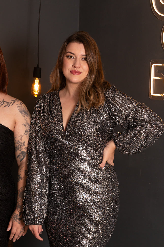 vestido paete ross decote v preto com prata