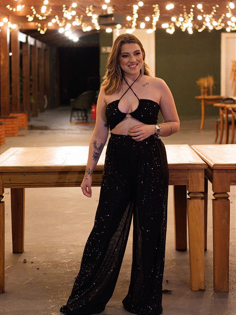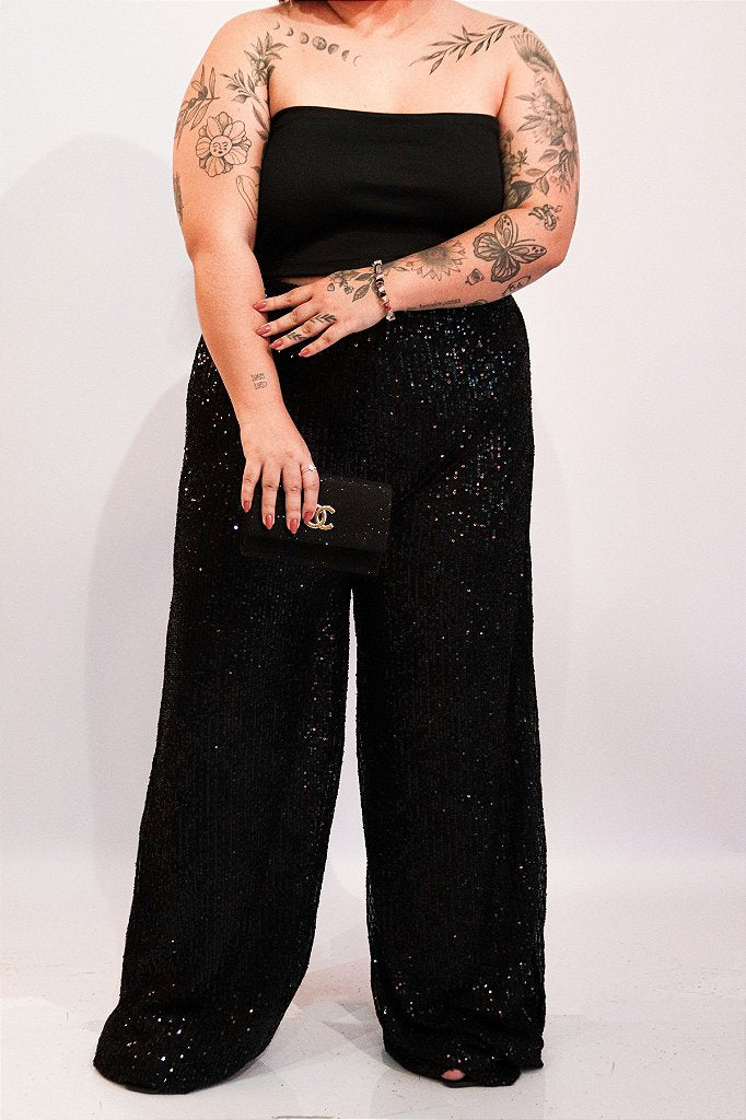 Calça pantalona de paetê desenvolvida com uma modelagem super ampla e confortável. Tanto o paetê quanto o forro tem uma ótima elasticidade que se ajustam ao corpo.