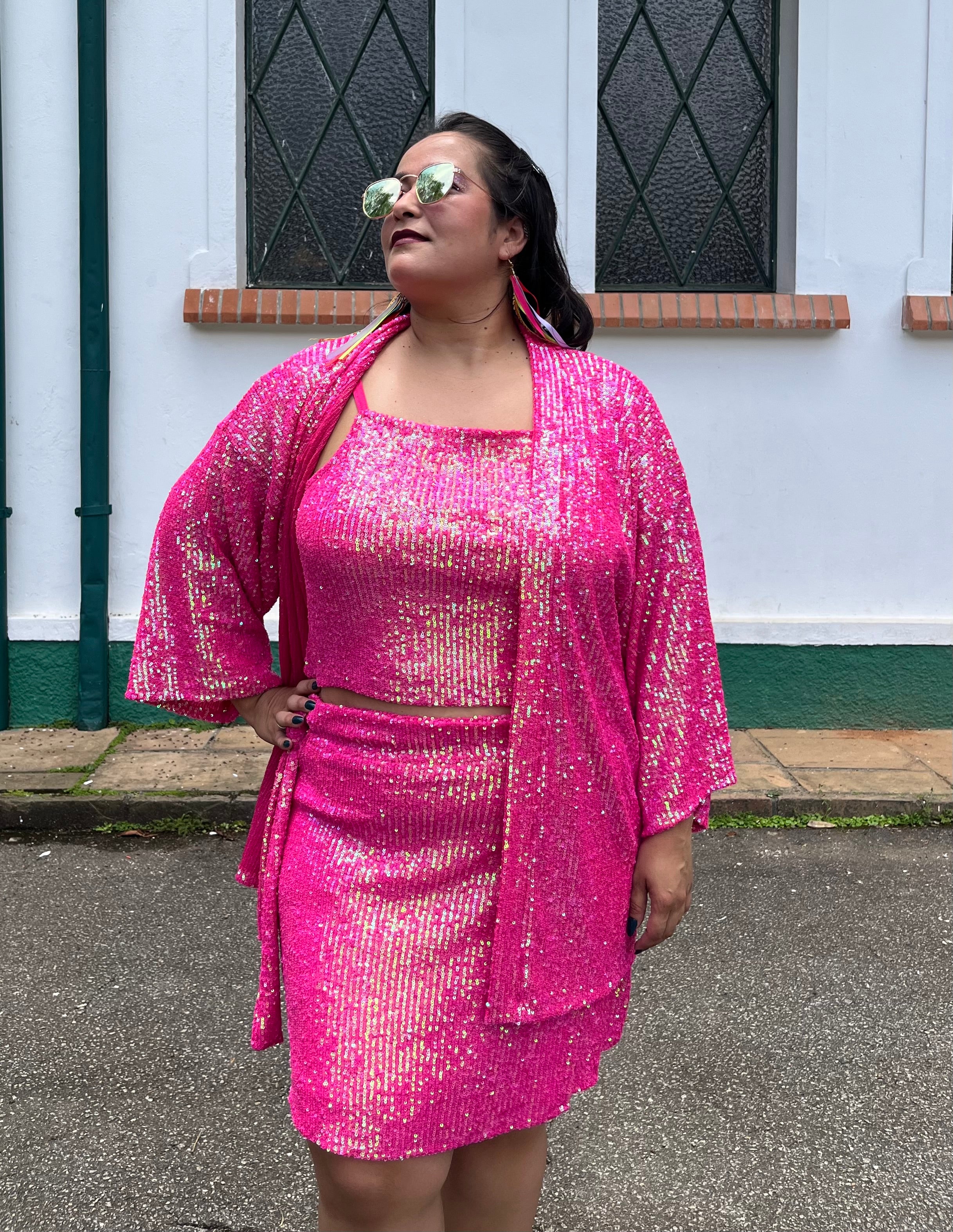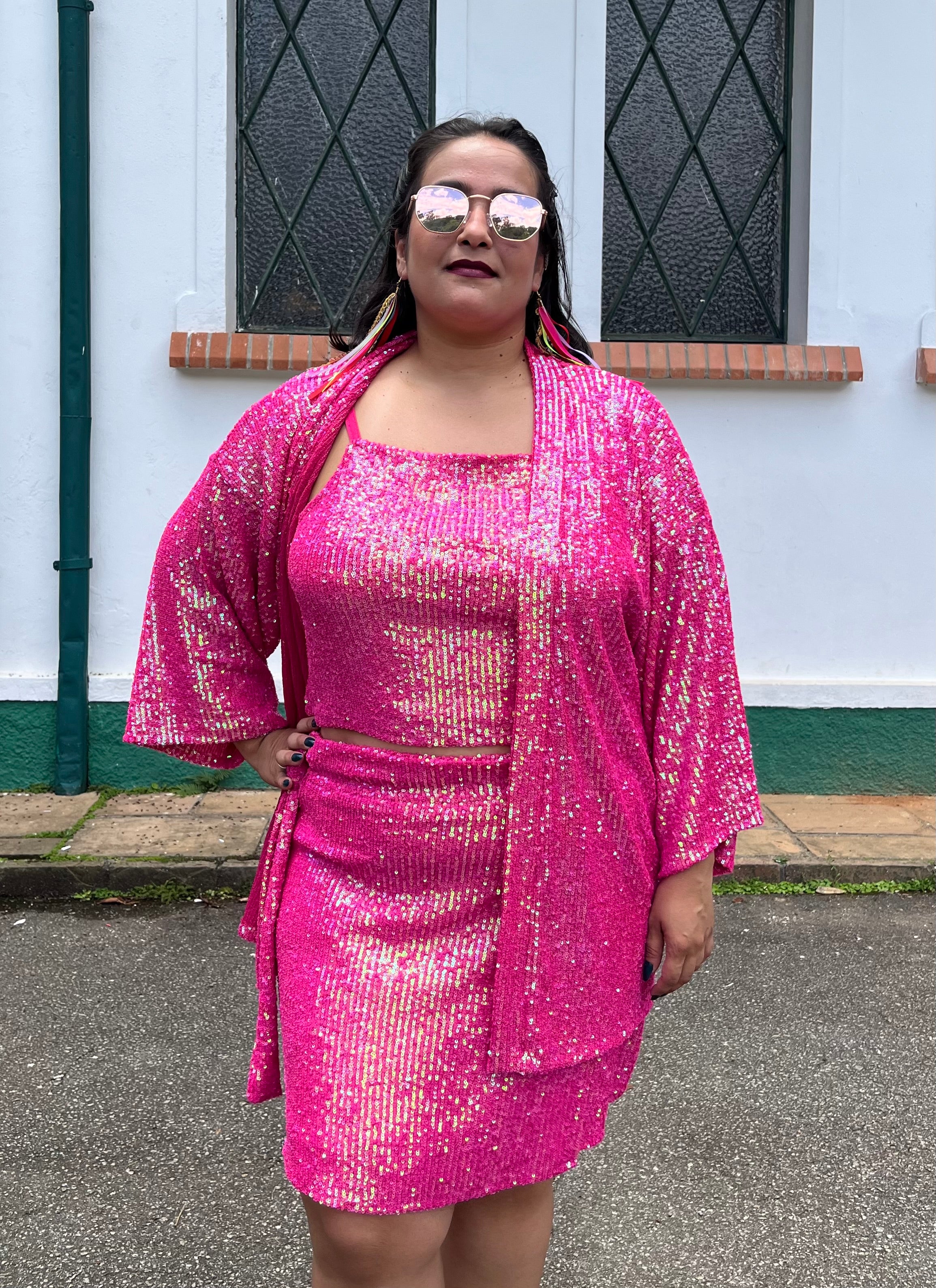 O Kimono de Paetê é a terceira peça que transforma qualquer look básico em uma produção digna de camarote. Em um rosa vibrante, a cor do charme e da descontração, ele foi modelado para abraçar todos os corpos com conforto e muito brilho.